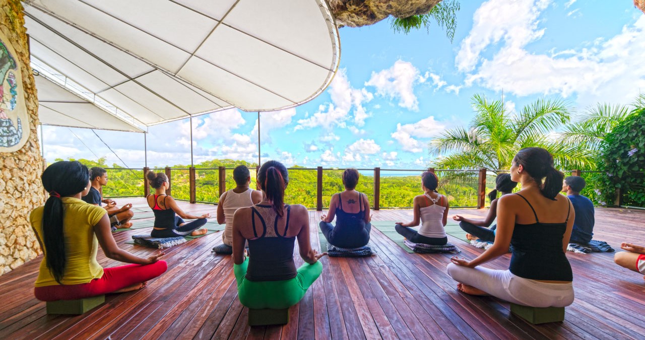 Escape to the tranquil retreat at Shiva's Cave Yoga Studio, a natural limestone grotto within MONTE PLACIDO Vacation Home Rentals on the Samaná Peninsula. The workout deck with Iyengar rope wall is perfect for up to 25 practitioners, while the upper level offers a space for meditation.